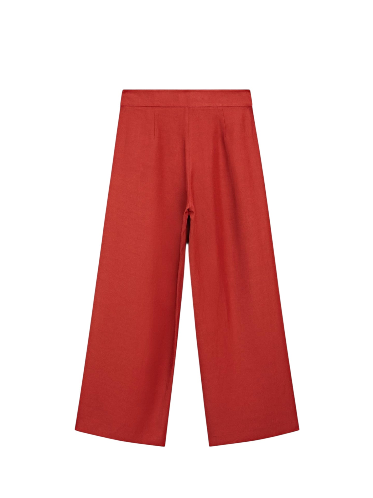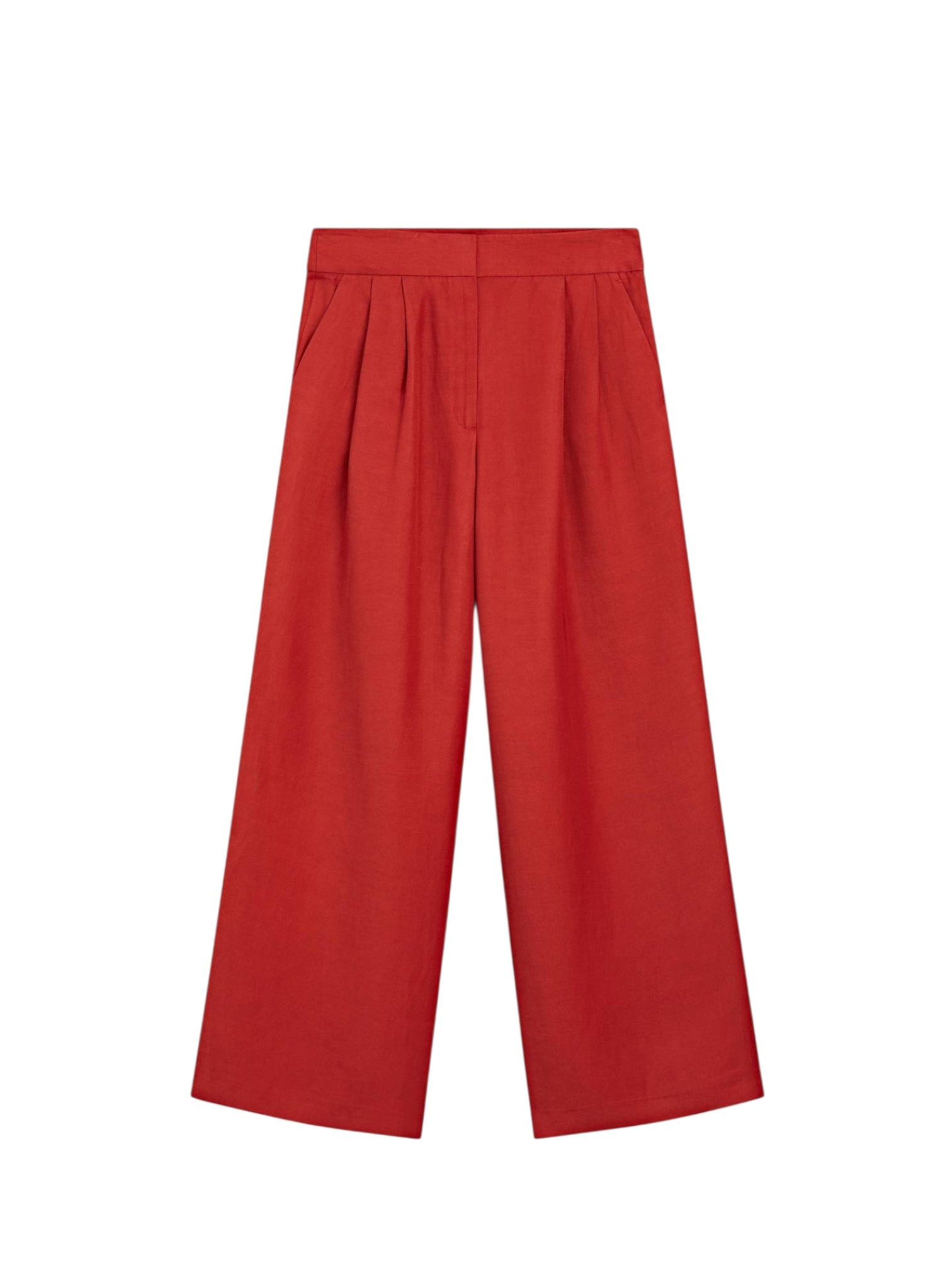 Wide-leg trousers in a flowing fabric. Zip fastening concealed by a placket, with hook-and-eye clasp and button. Two side pockets. Double dart detail on the front.