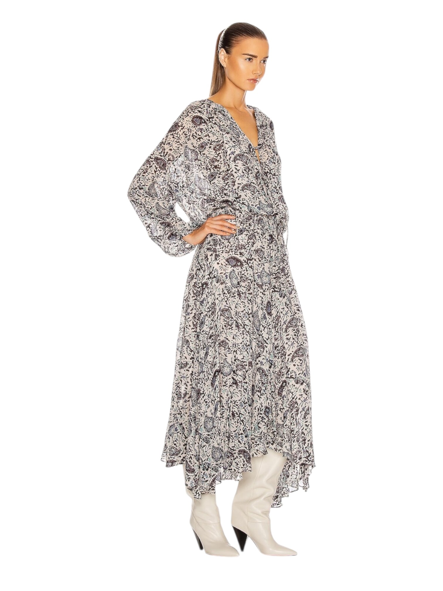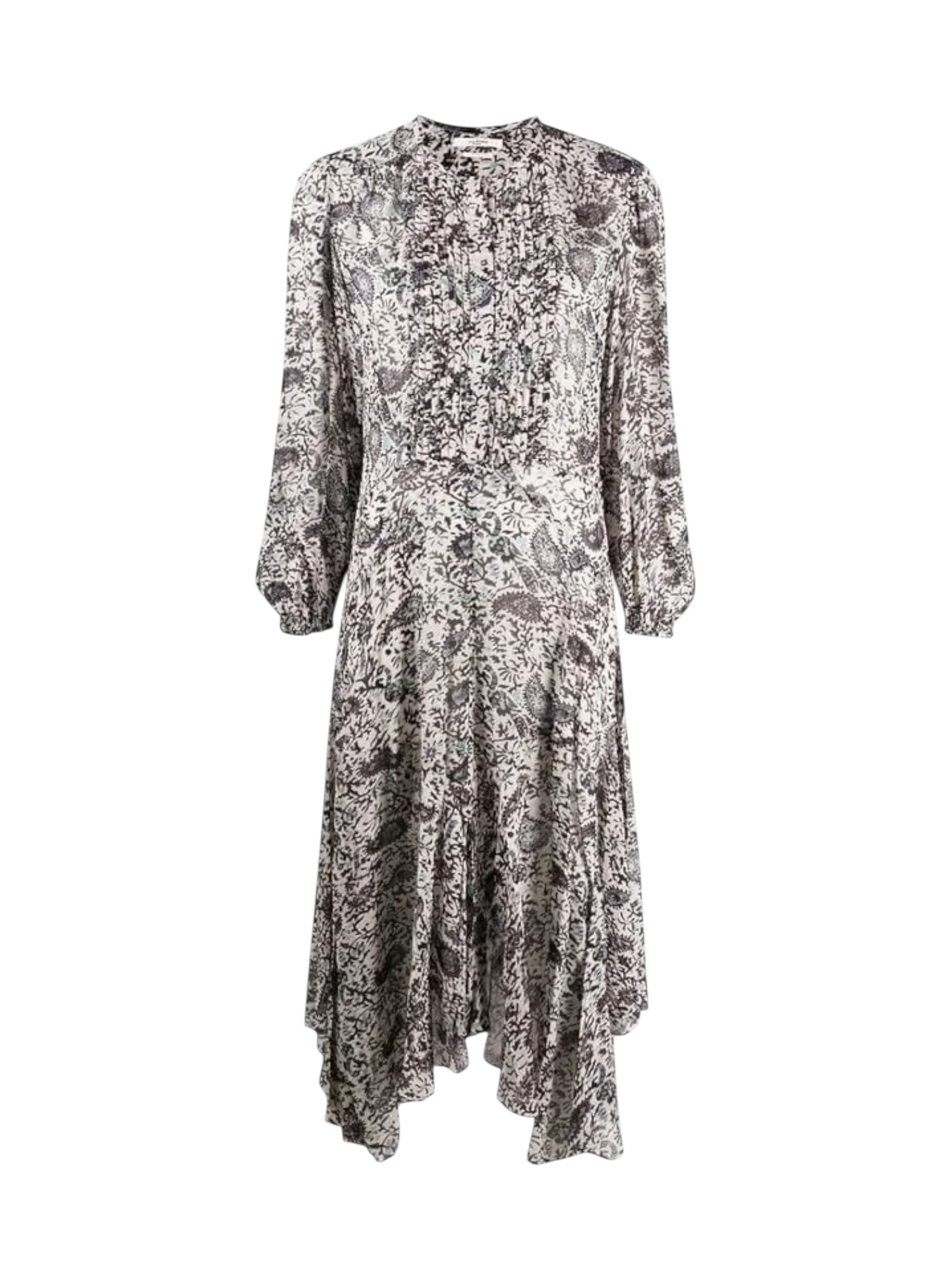 Chalk/black handkerchief-hem paisley midi dress from ISABEL MARANT ÉTOILE featuring paisley print, pleat detailing, round neck, long sleeves and handkerchiet hem.