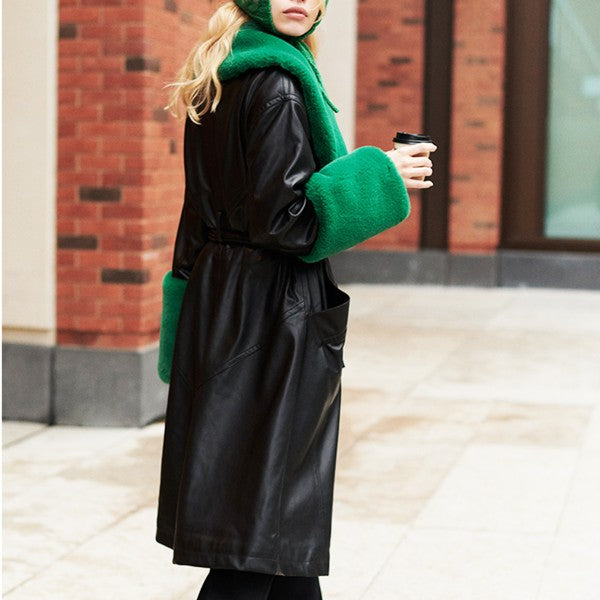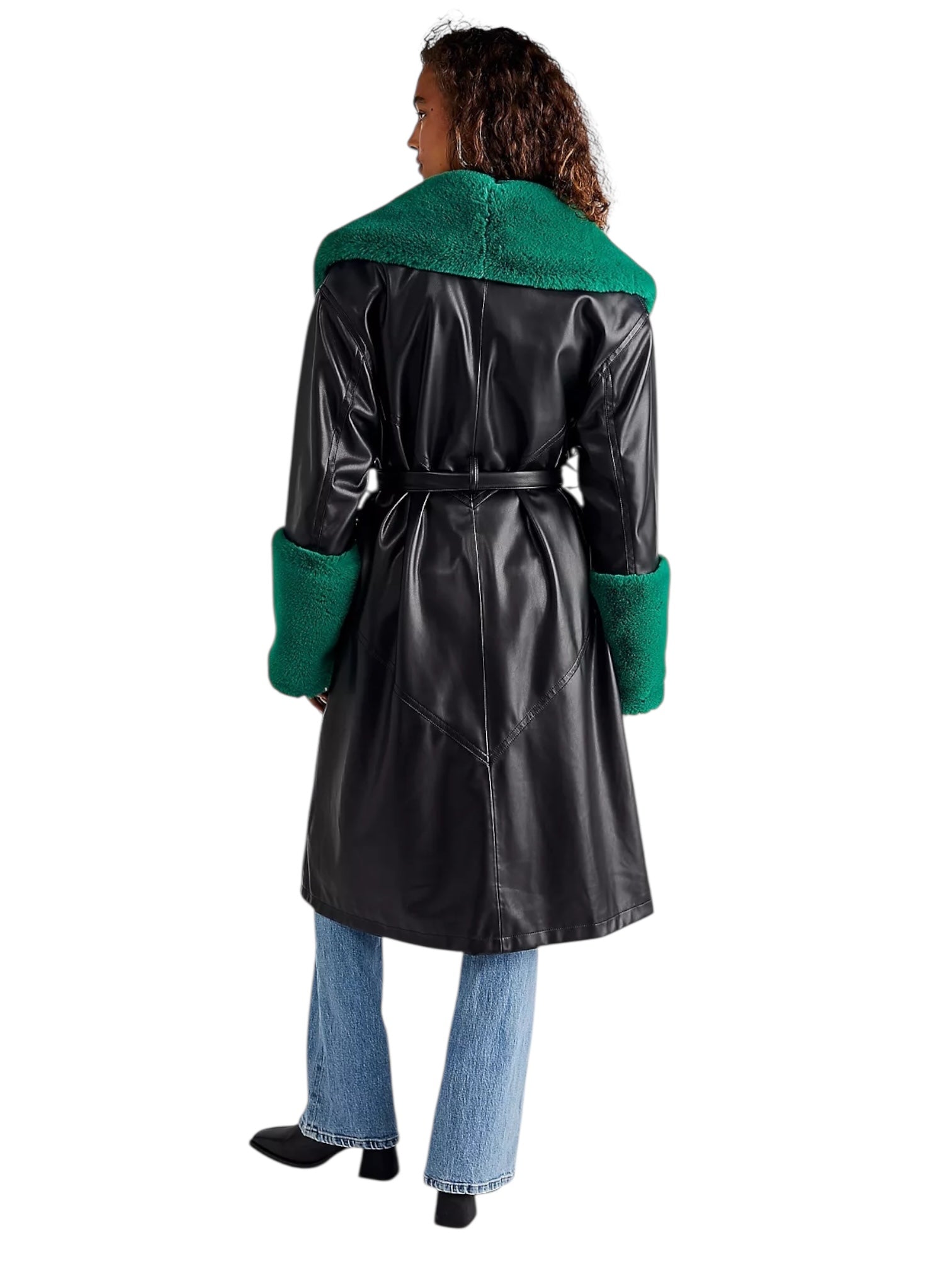 Take your coat collection to the next level with this so cool version featured in a luxe faux leather fabrication with colorful, contrasting fur trim for added dimension.