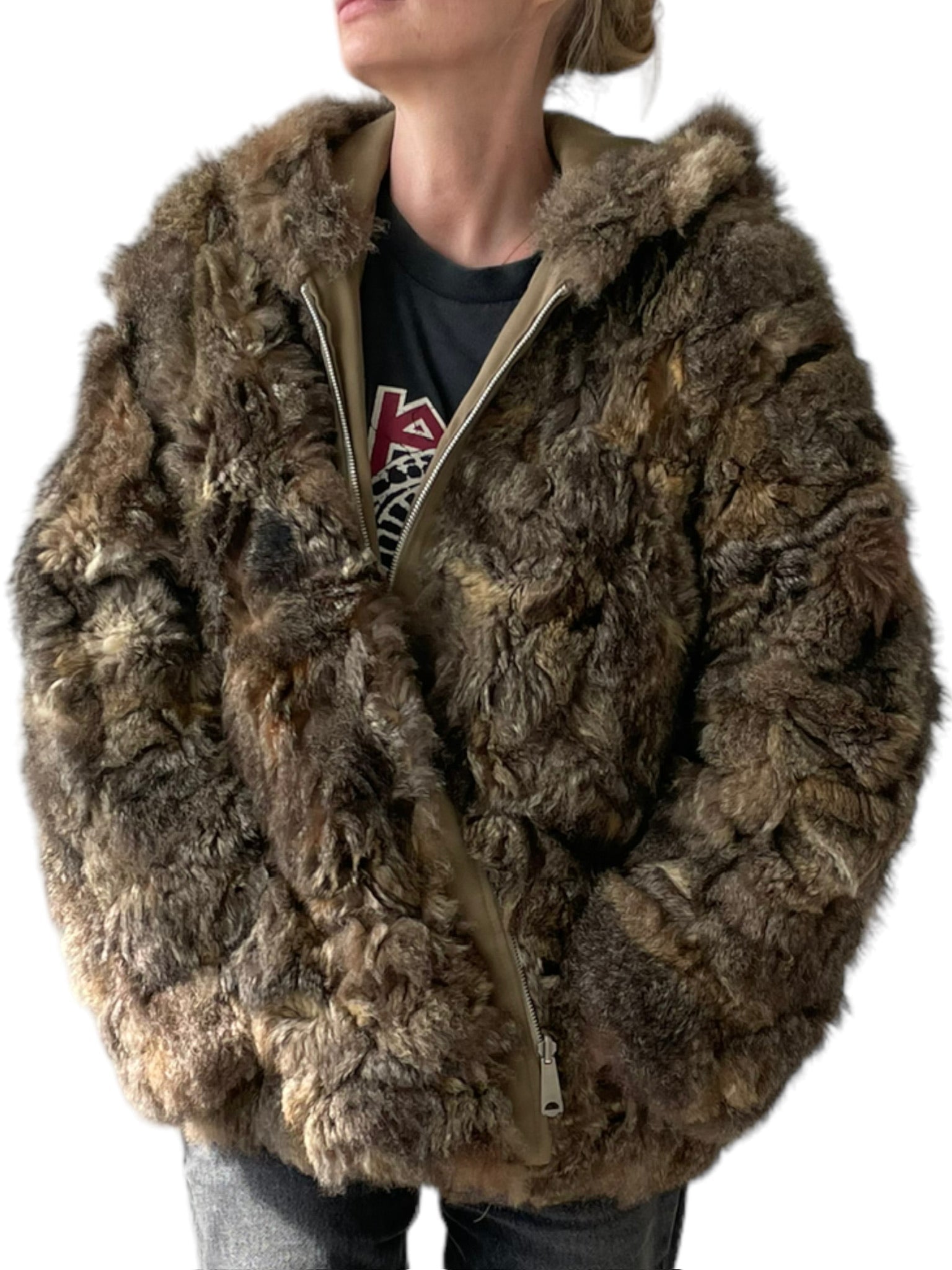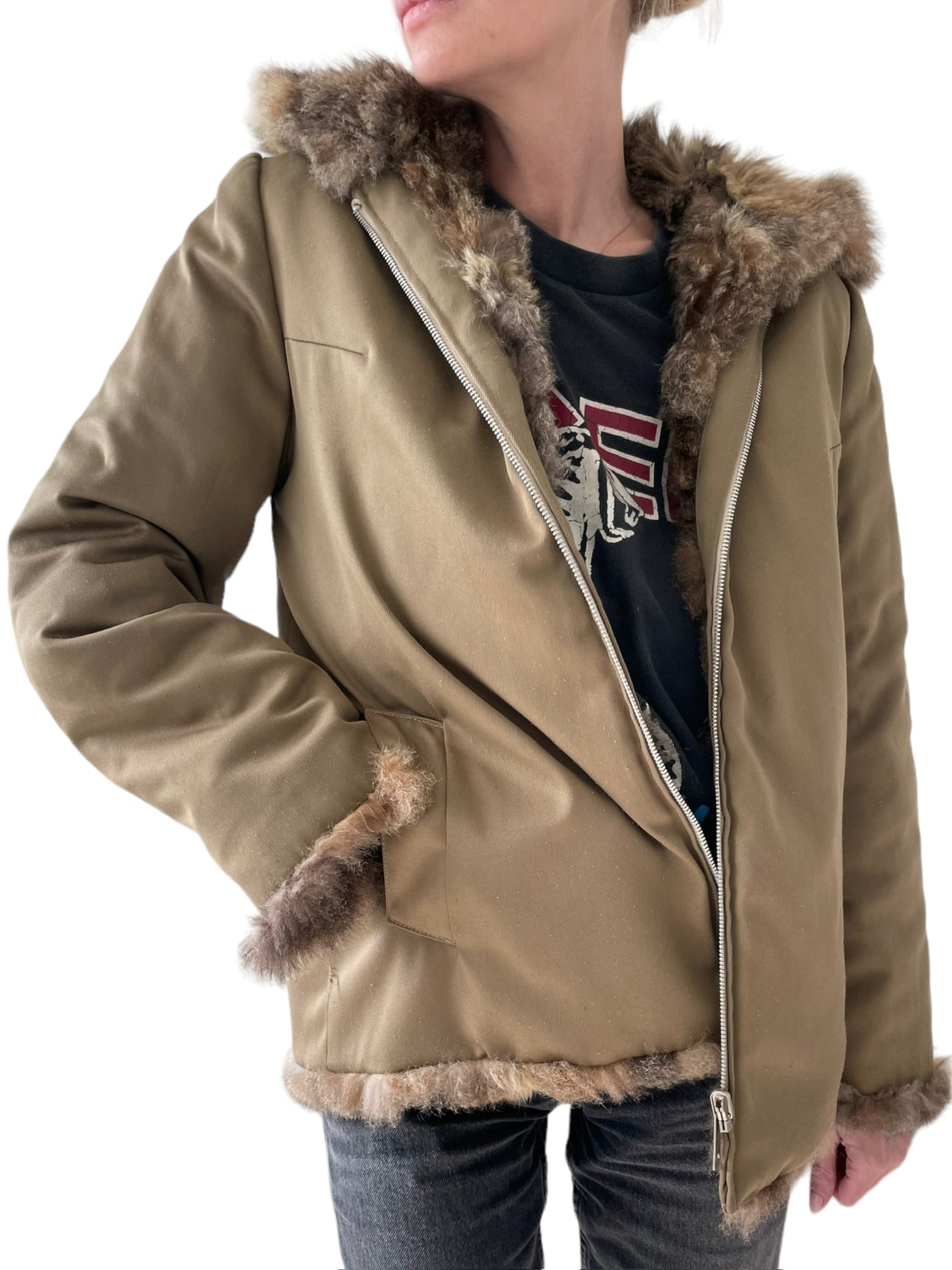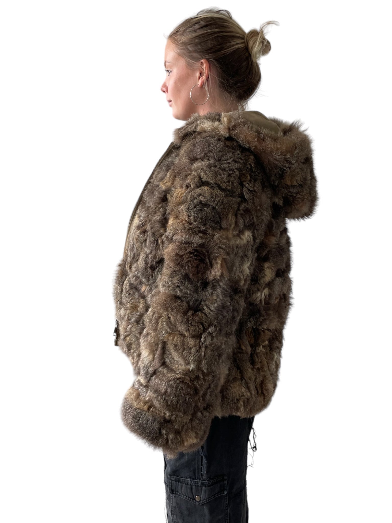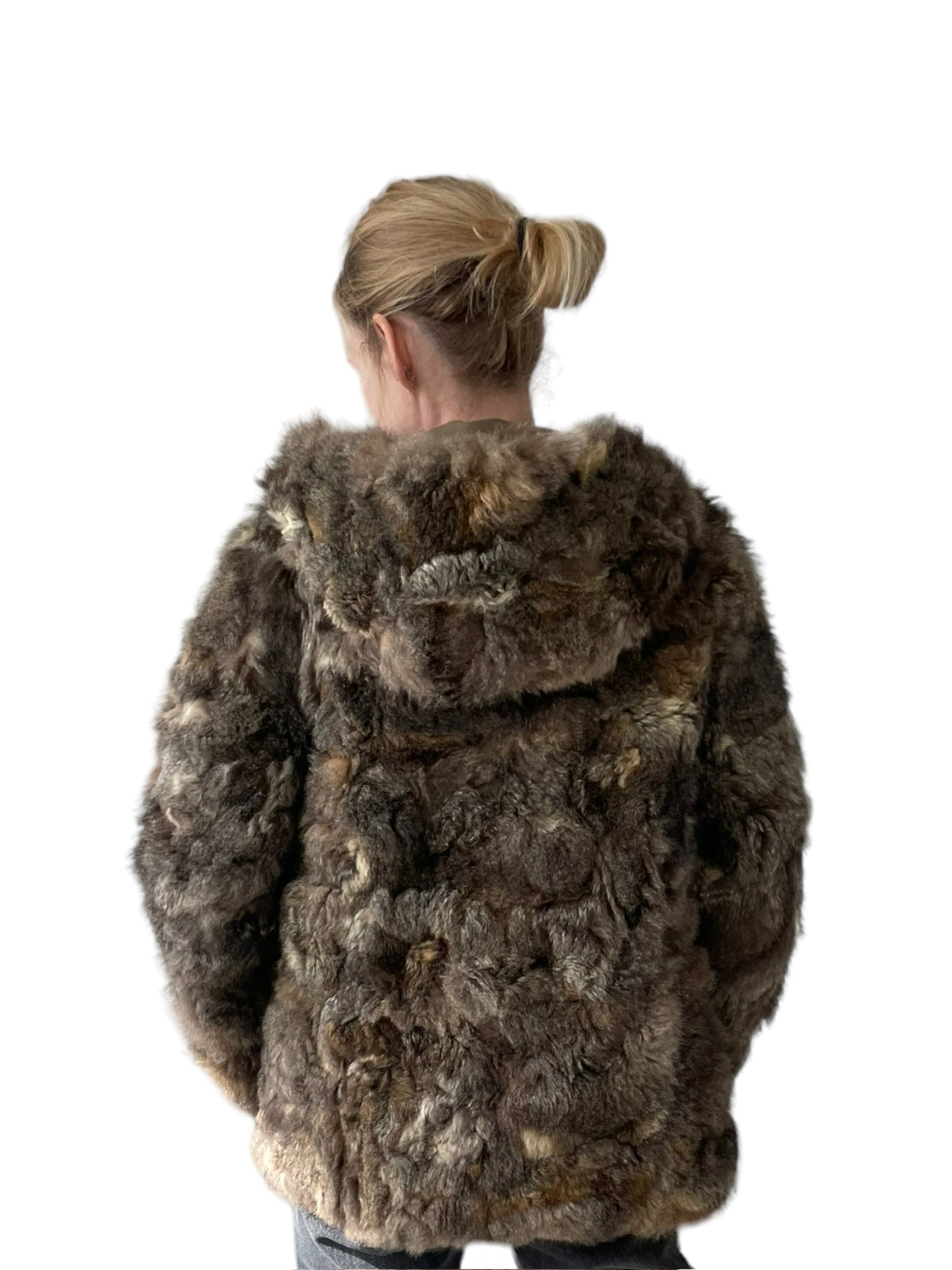 Pels sem er reversible (hægt að snúa við og klæðast á tvo vegu), með hettu og rennilás. Ekta feldur. Tveir vasar að innan og utan.