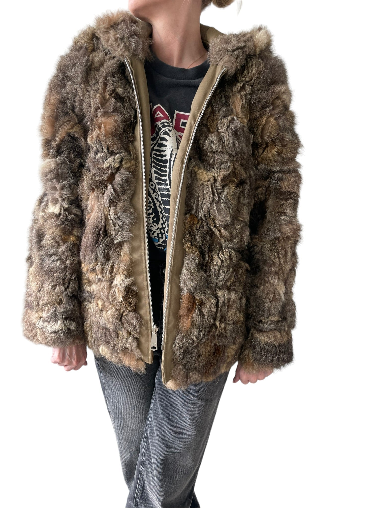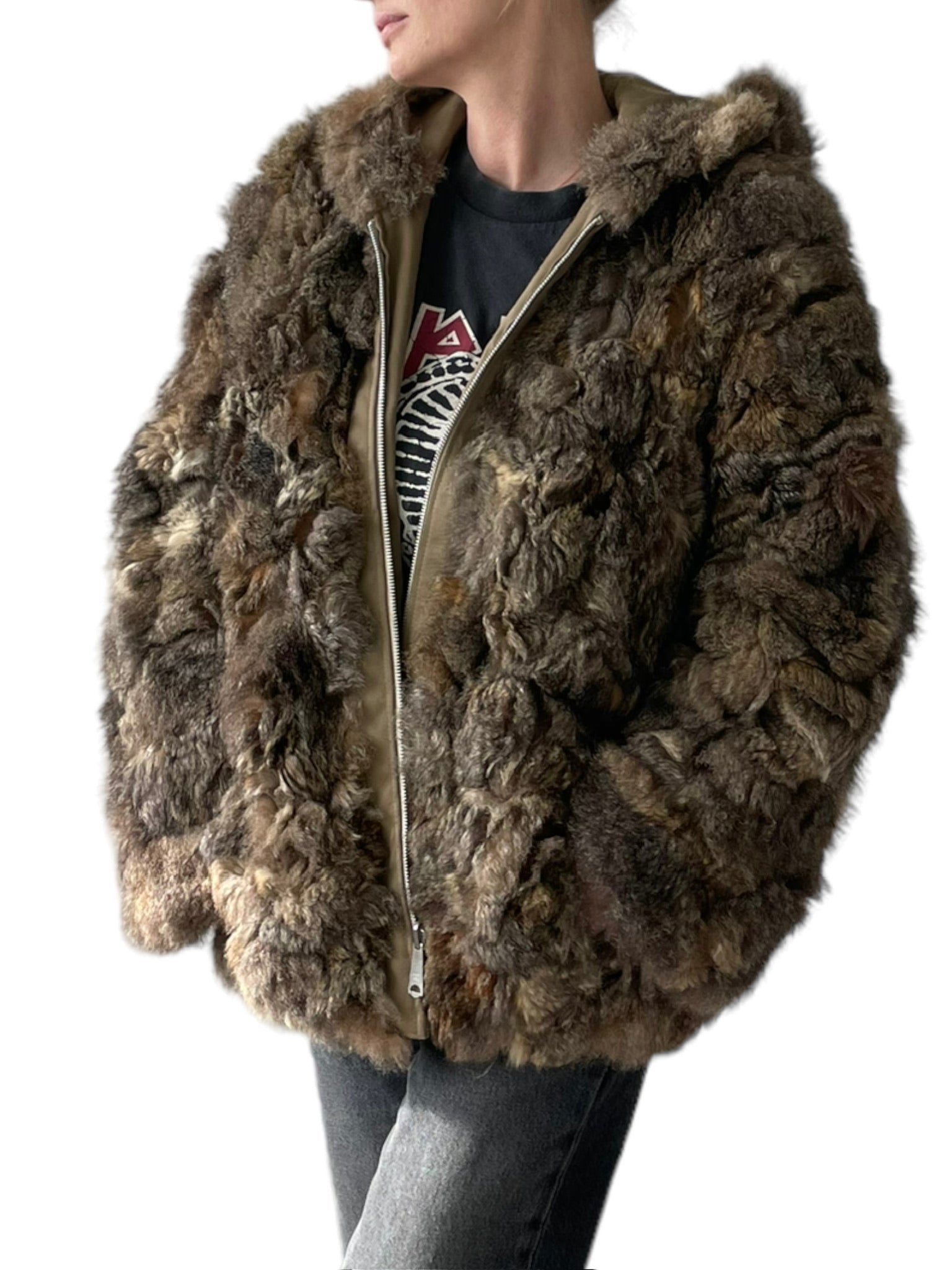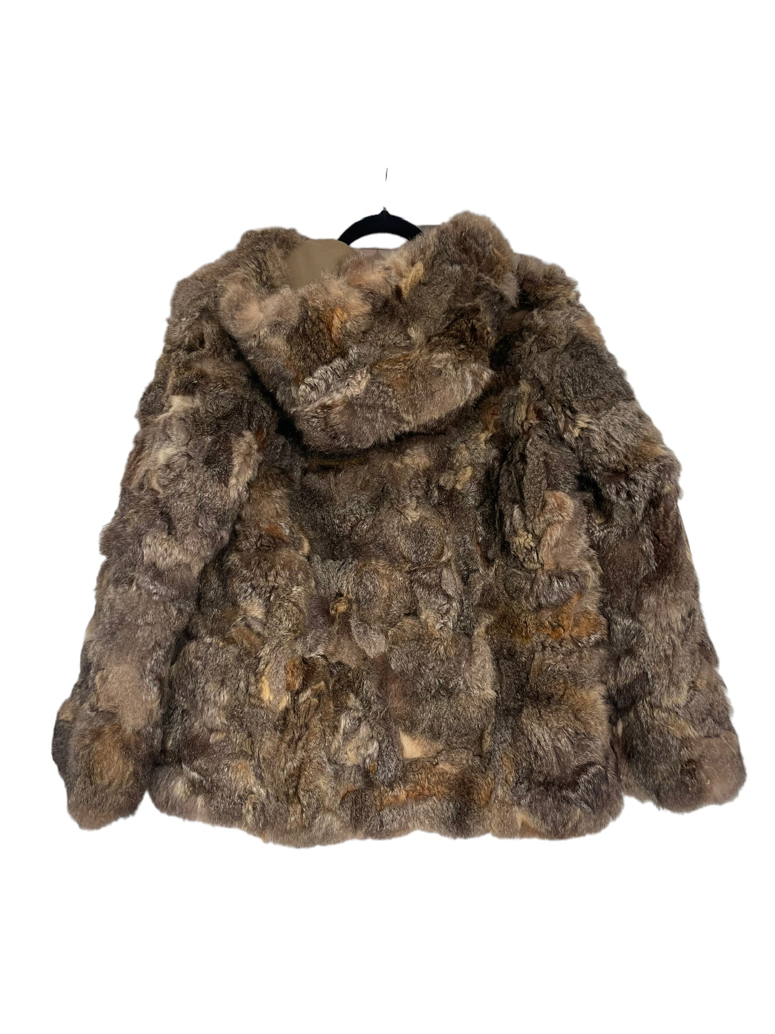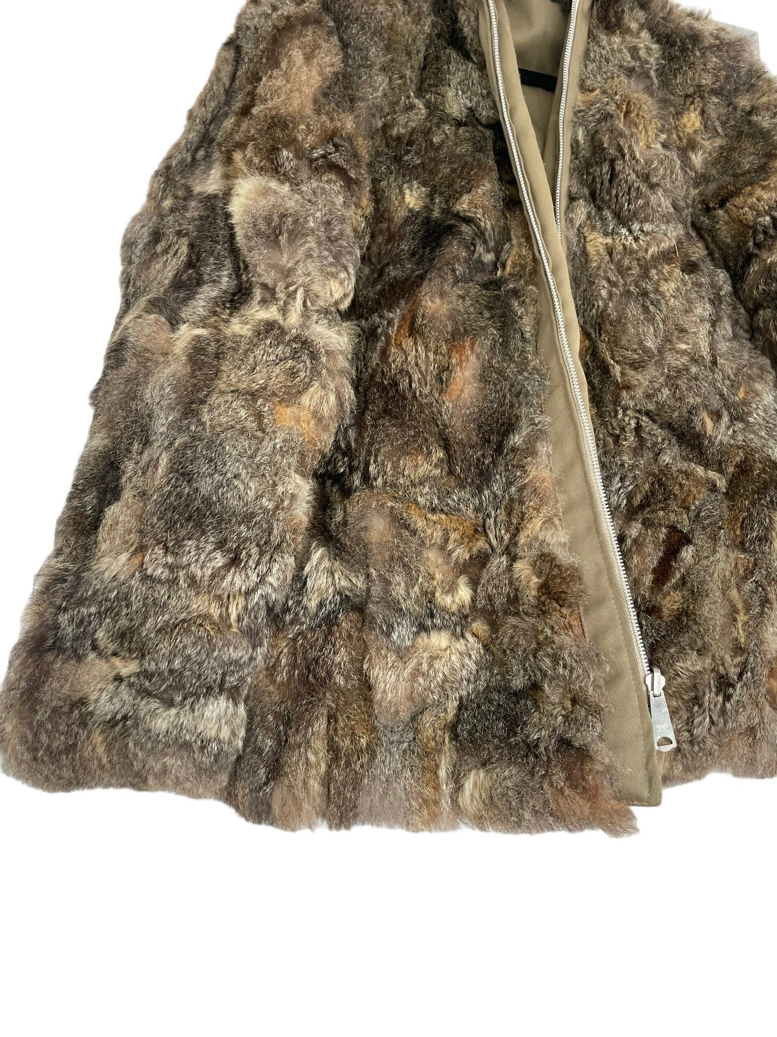 Pels sem er reversible (hægt að snúa við og klæðast á tvo vegu), með hettu og rennilás. Ekta feldur. Tveir vasar að innan og utan.