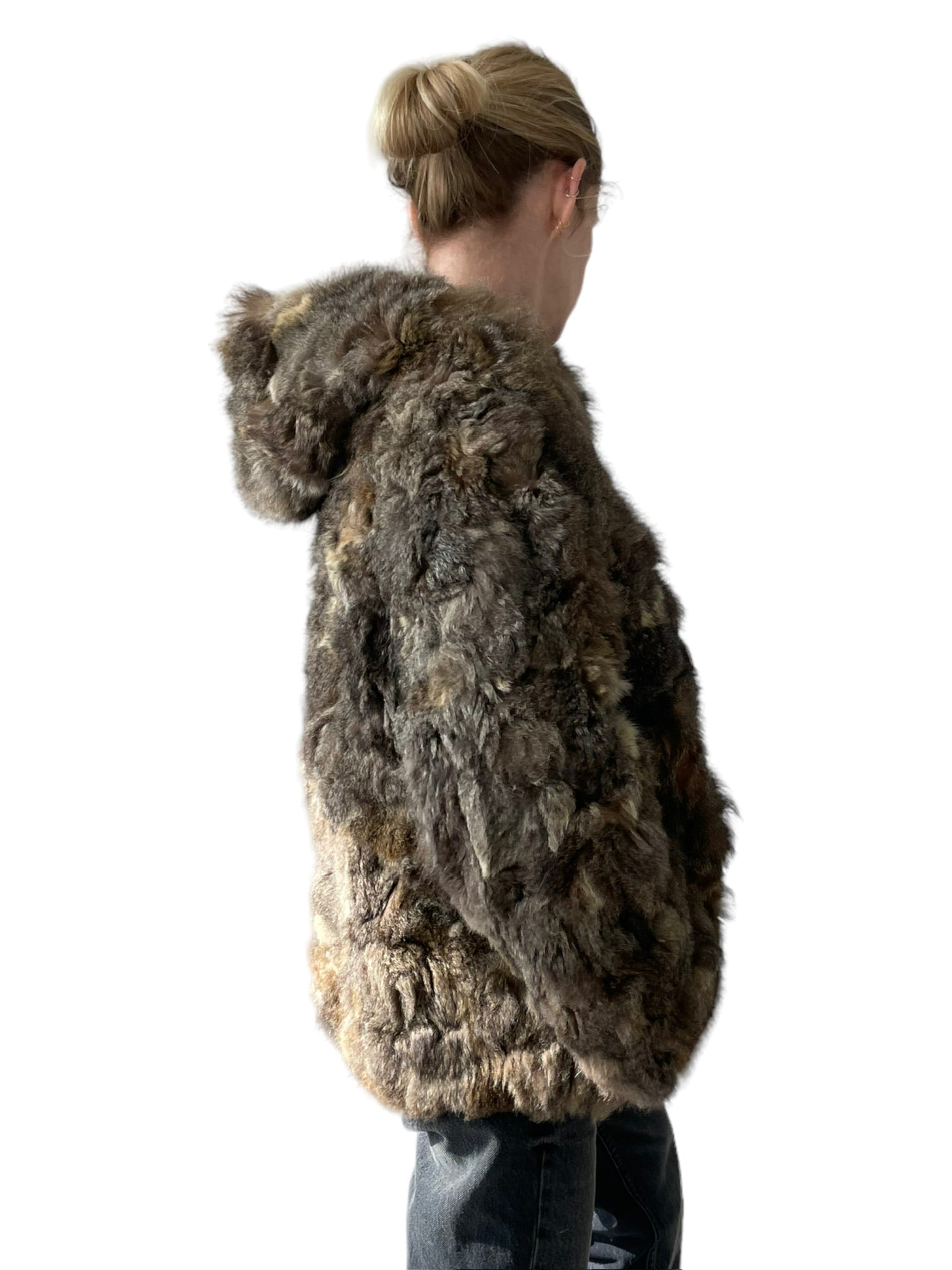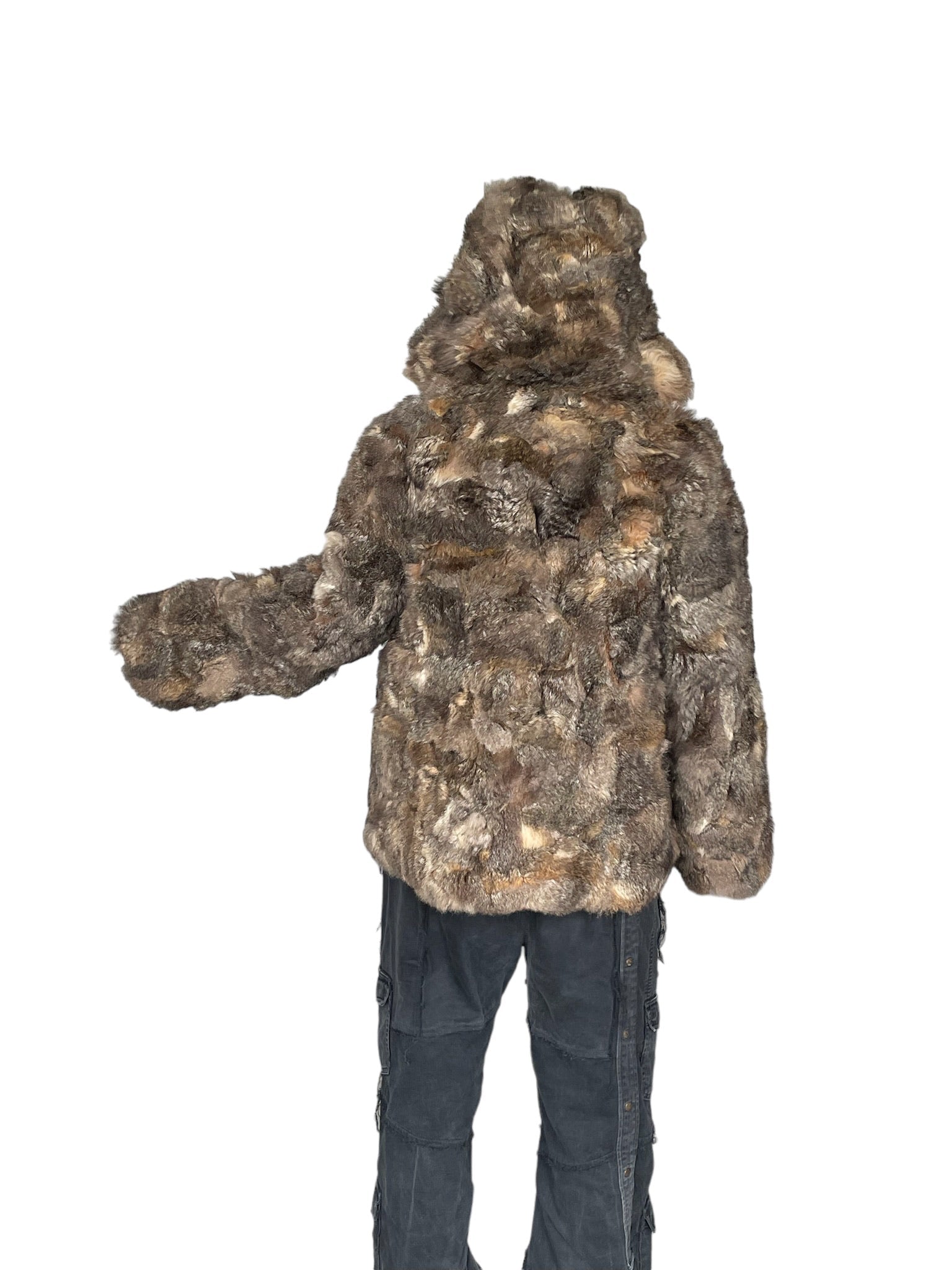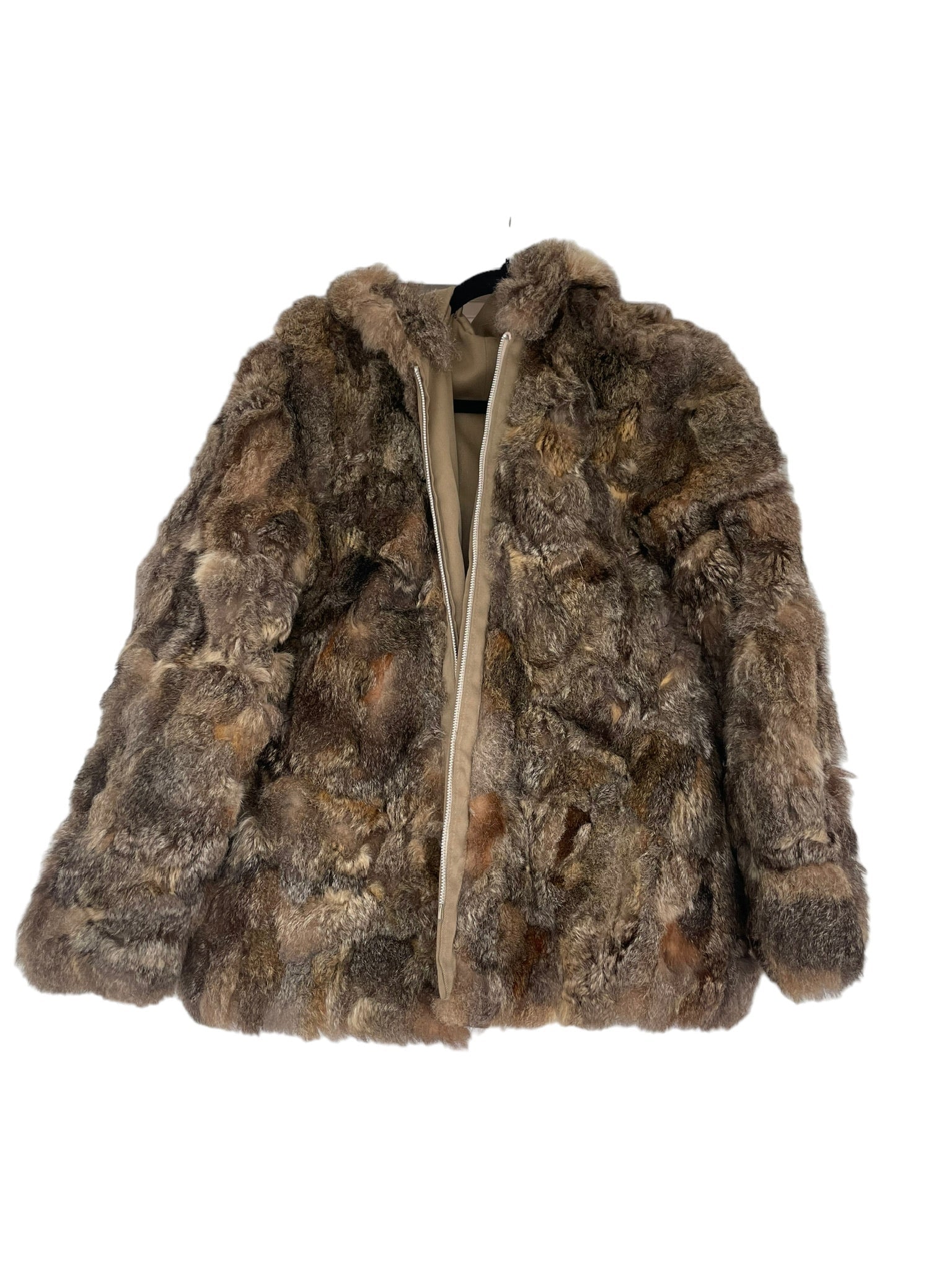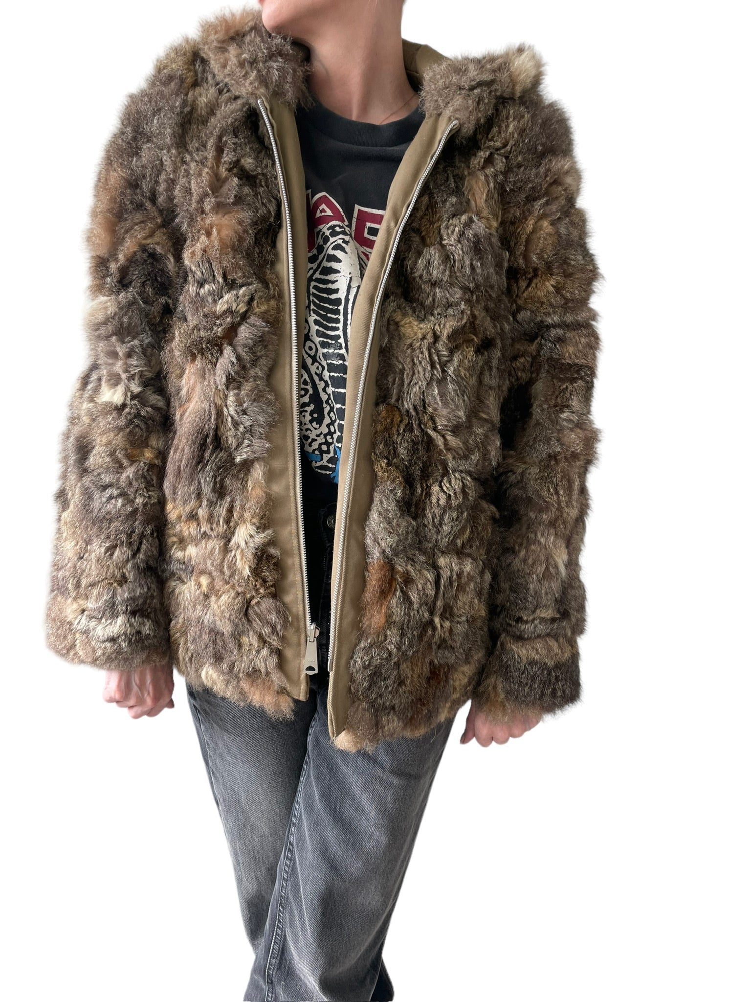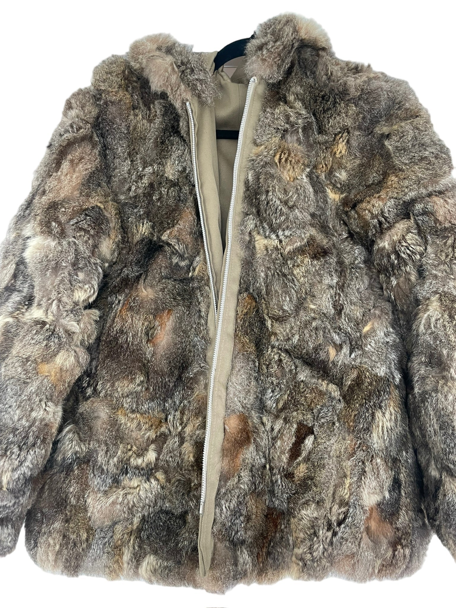 Pels sem er reversible (hægt að snúa við og klæðast á tvo vegu), með hettu og rennilás. Ekta feldur. Tveir vasar að innan og utan.