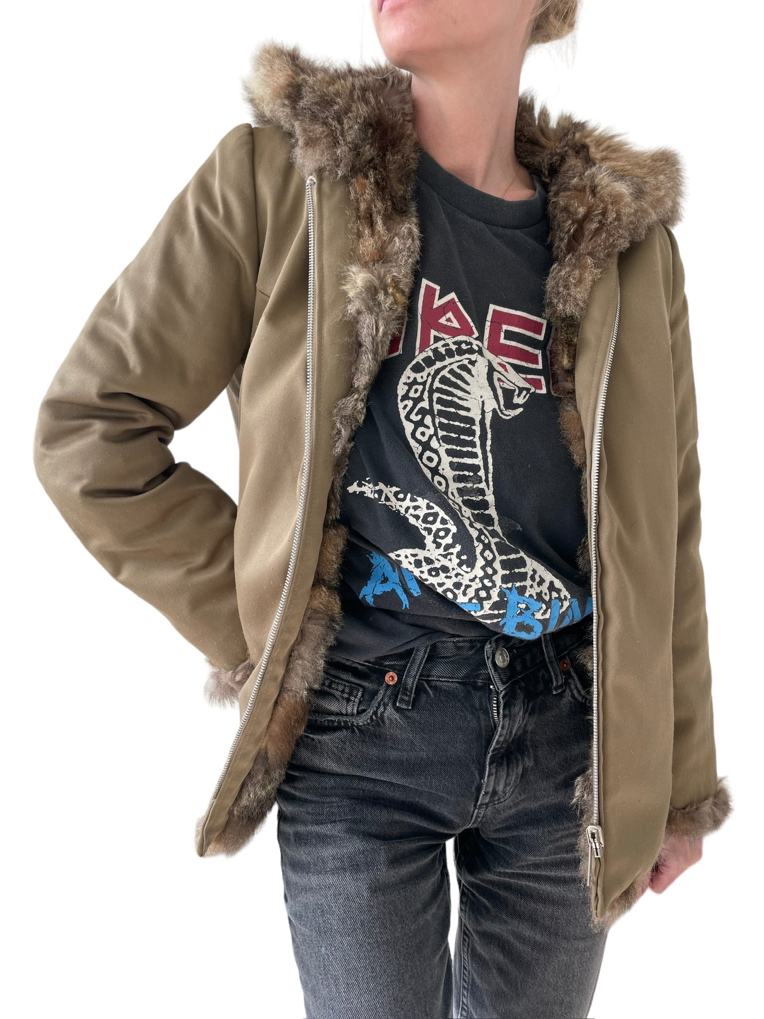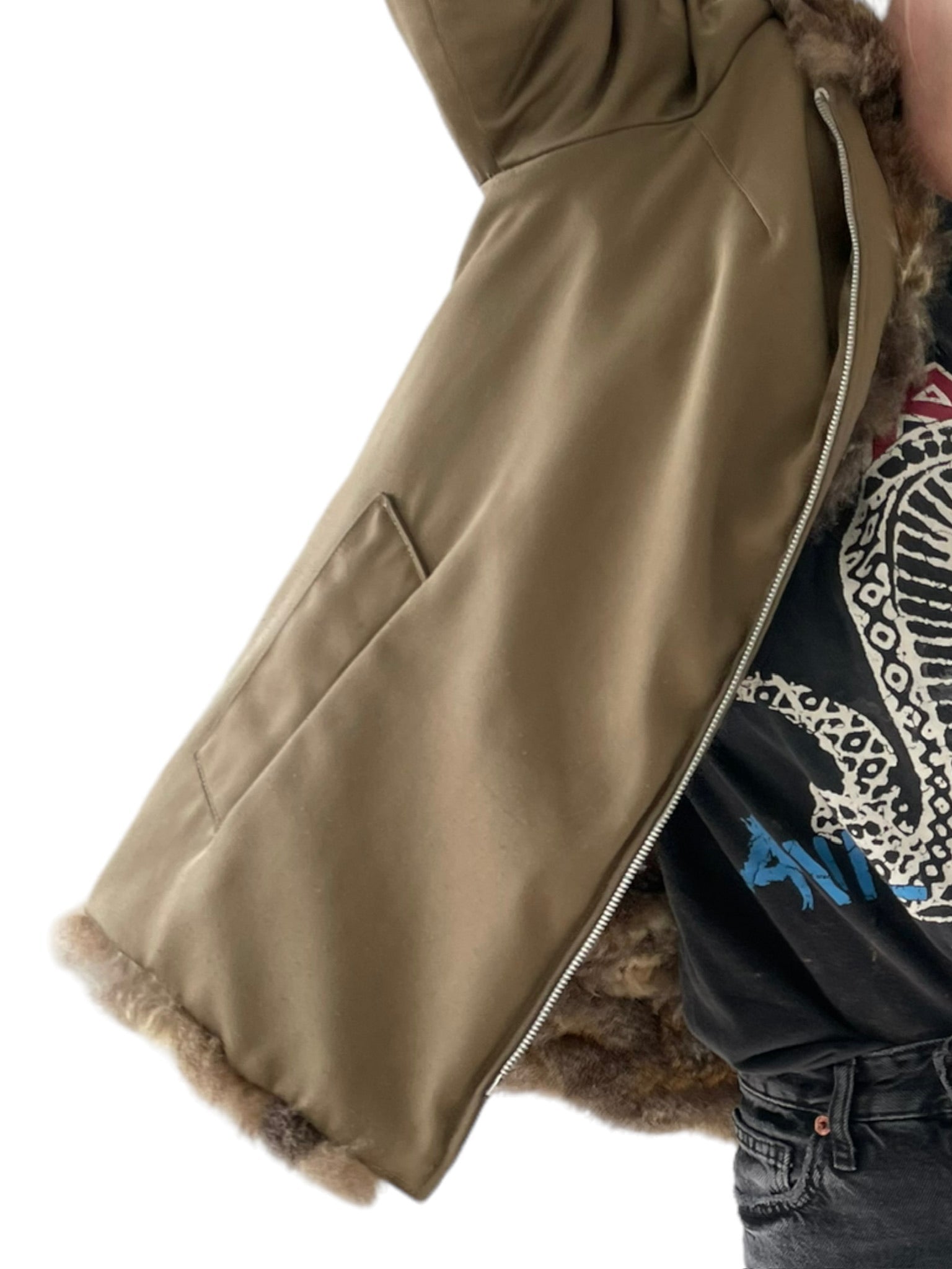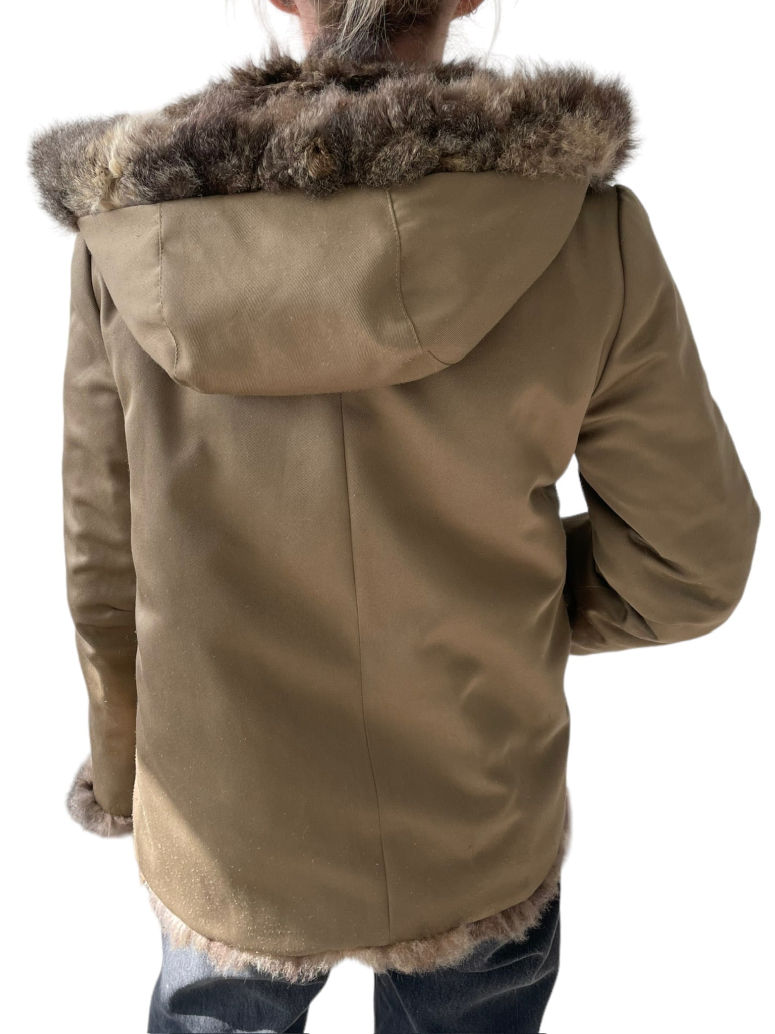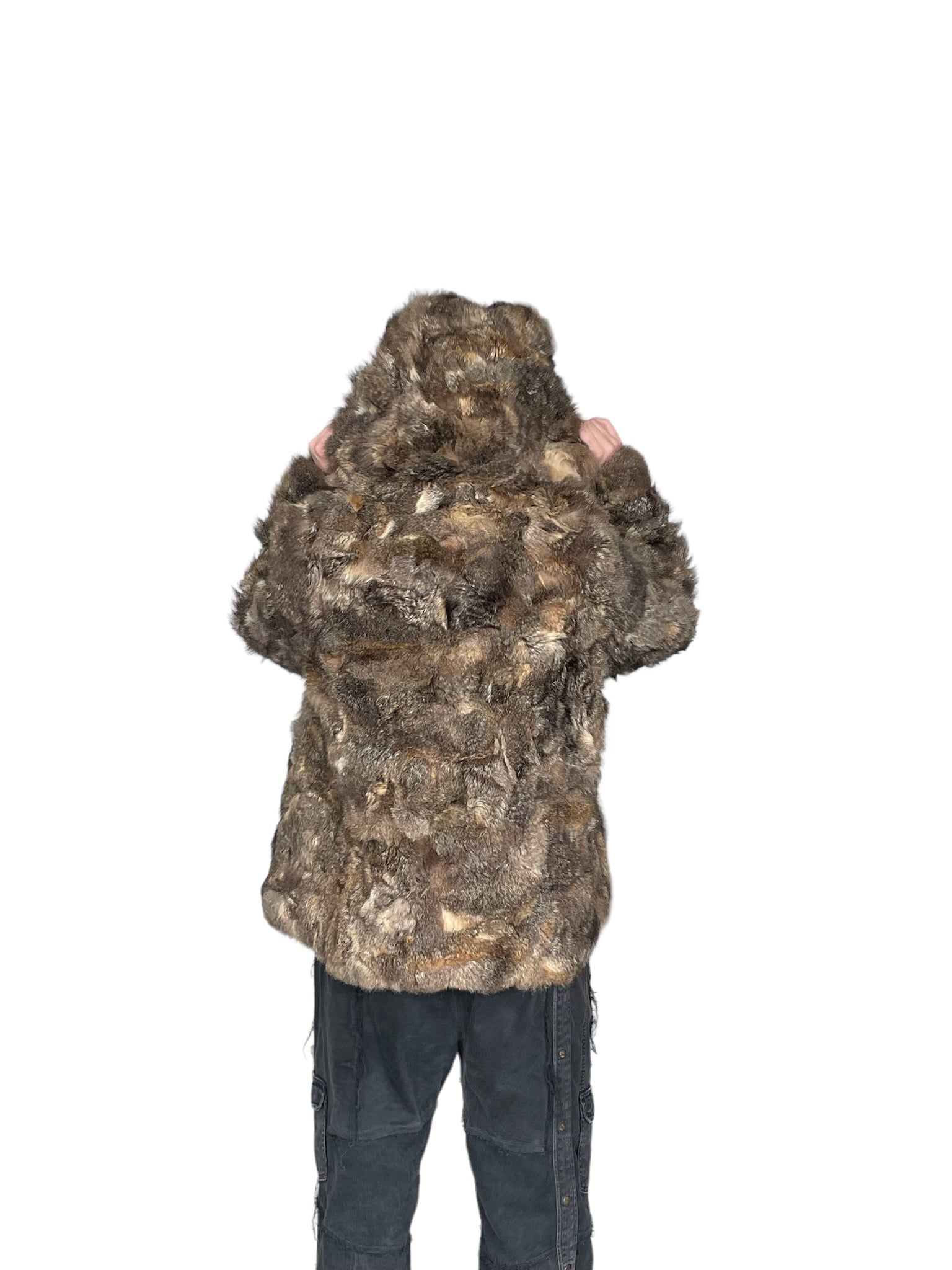 Pels sem er reversible (hægt að snúa við og klæðast á tvo vegu), með hettu og rennilás. Ekta feldur. Tveir vasar að innan og utan.
