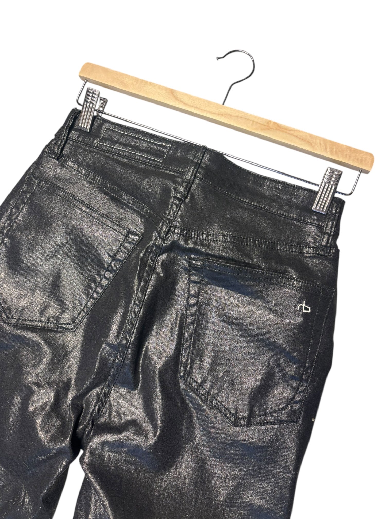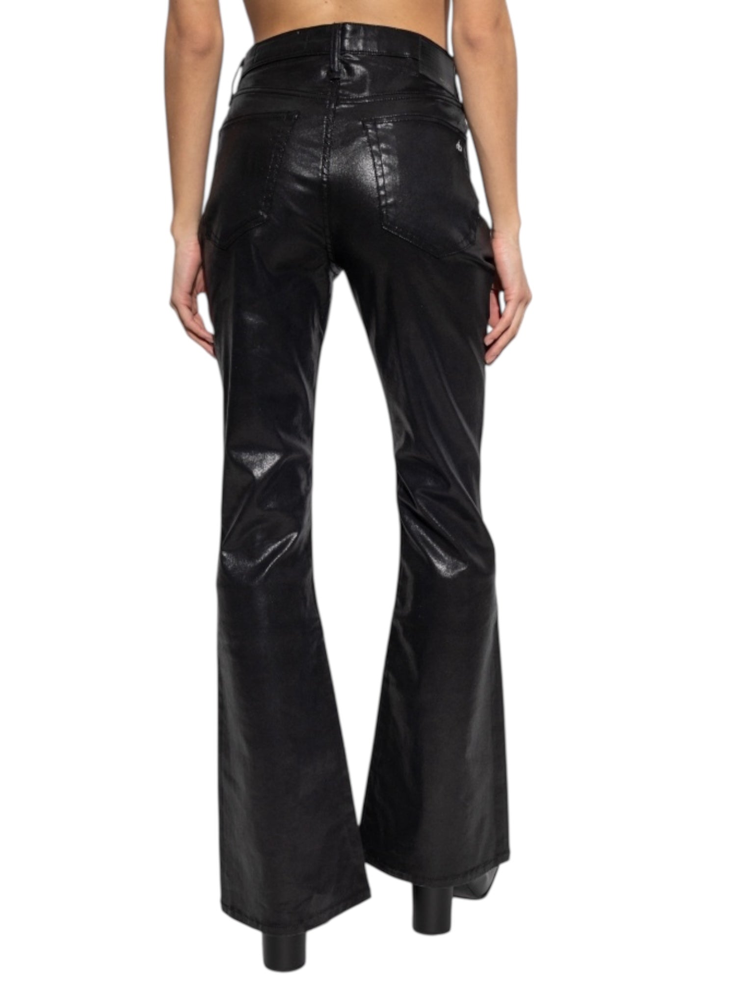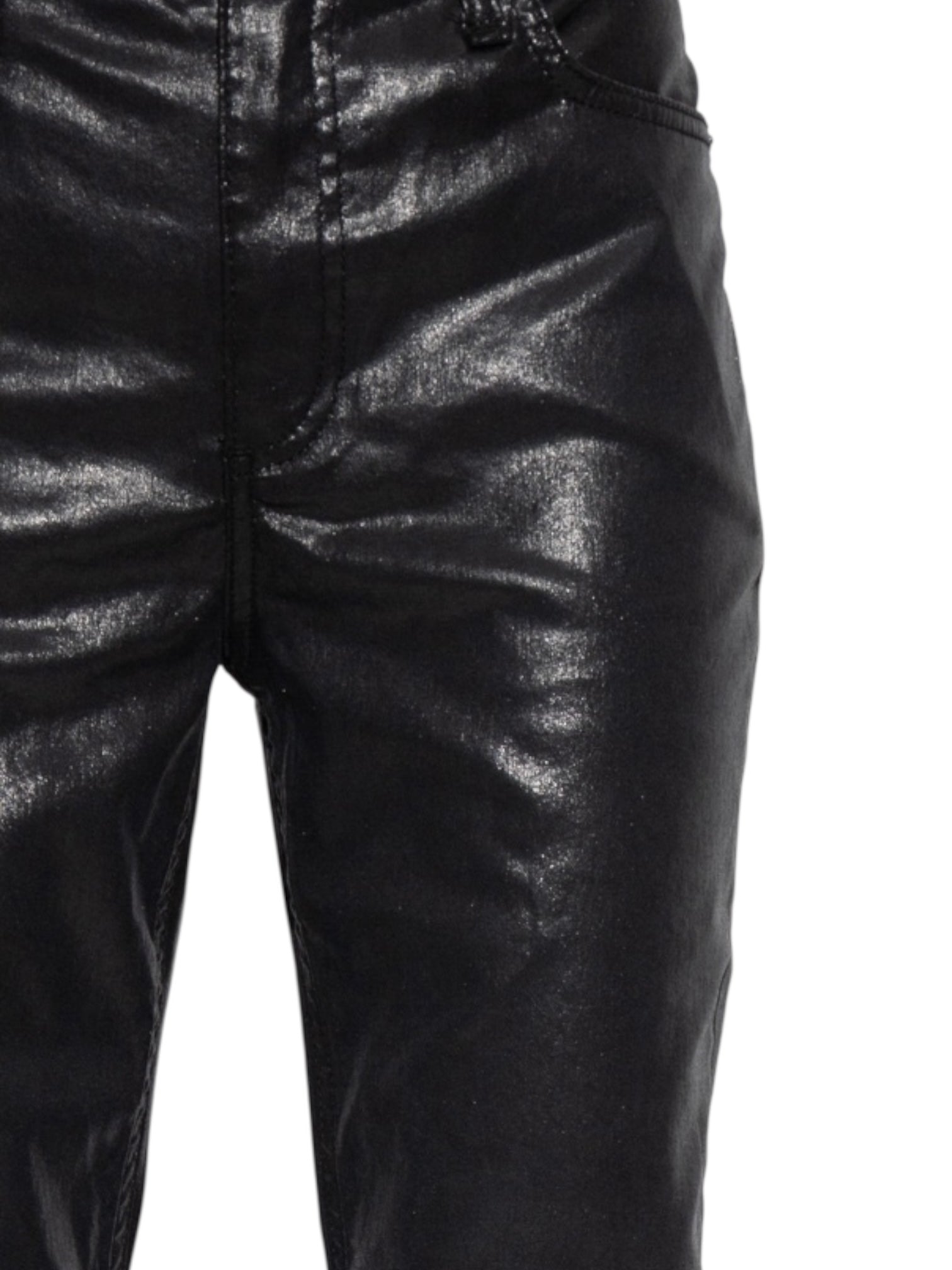 Crafted from an elasticated denim blend, the fabric glistens with a light sheen, distinctively elevating the trousers above conventional matt designs. The deep black hue and polished surface impart an air of understated sophistication, ensuring a contemporary yet timeless aesthetic.