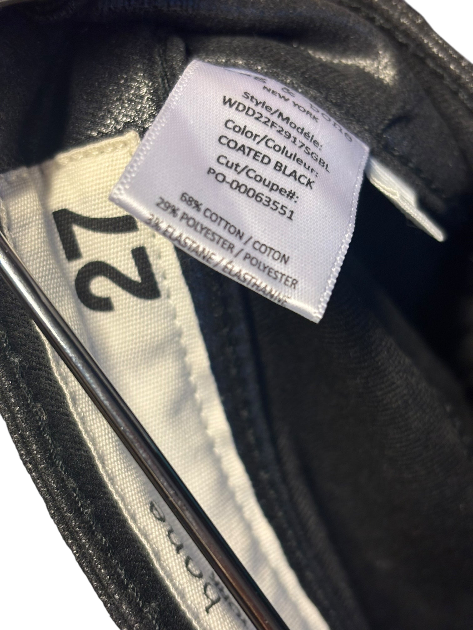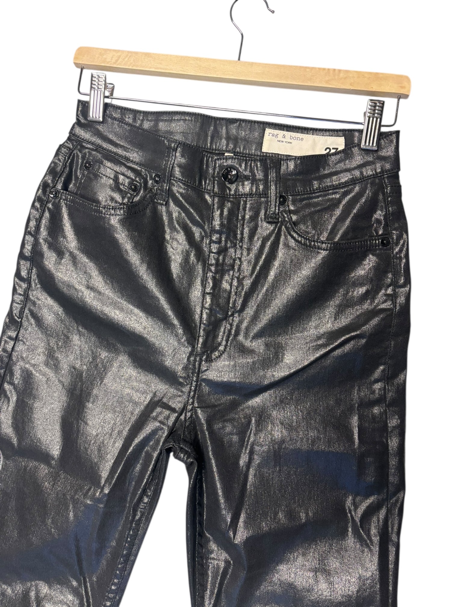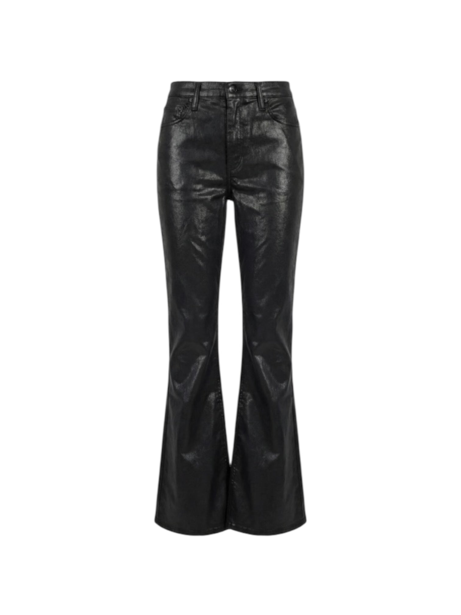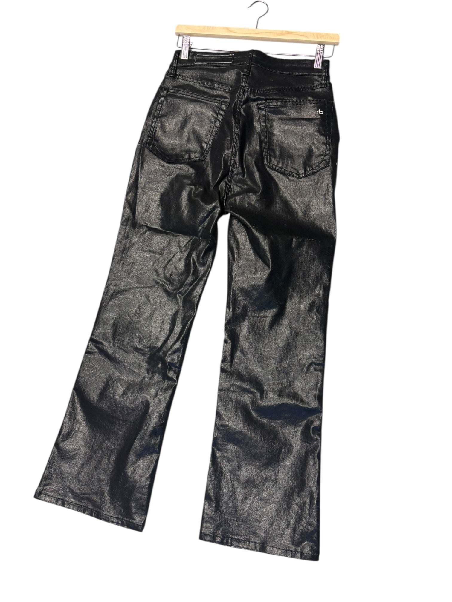Crafted from an elasticated denim blend, the fabric glistens with a light sheen, distinctively elevating the trousers above conventional matt designs. The deep black hue and polished surface impart an air of understated sophistication, ensuring a contemporary yet timeless aesthetic.